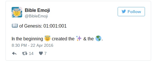 這本《Emoji 聖經》以 King James Version 版本改編,將聖經內 66 卷書加入 Emoji。開發者認為這樣可以讓千禧年後出生的新生代更有興趣讀經,亦令分享福音變得更有趣味。不願透露姓名的開發者相信,未來 100 年很有可能出現一本以 Emoji 寫成的聖經,於是決定試試。開發者認為此舉亦可以減少字數,方便用戶將聖經經文透過有字數限制的 SMS 短訊或 Twitter 發出。