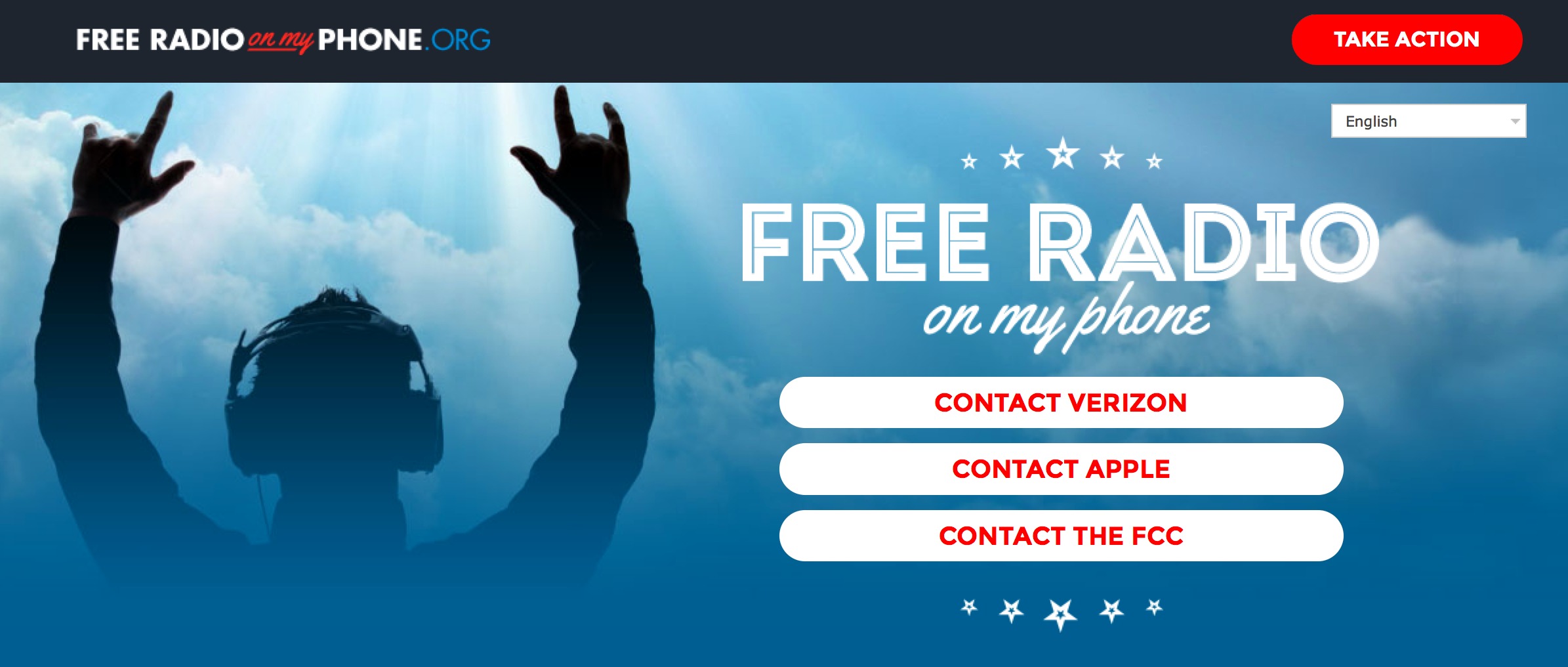 「Free Radio On My Phone」由美國的電台、媒體組織和緊急救援機構推動,現時電訊商 Verizon 和 Apple 仍然拒絕要求。要求將 FM 收音機解除封印,並不單純是為了節省數據費用和娛樂,更重要的是在緊急時候,FM 收音機能夠扮演發放資訊的角色,就算電訊商服務受阻或用戶沒有數據計劃都可以接收資訊。
