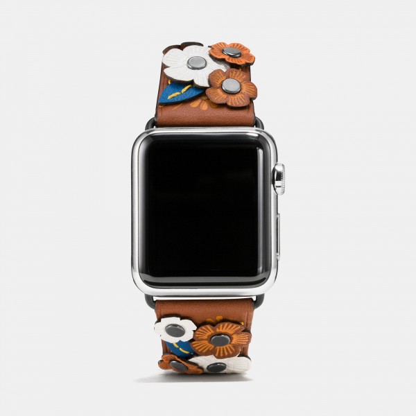 Leather Strap with Charms 一如其名,真皮錶帶上面有 Coach 的經典小吊飾作裝飾;而 Wild Beast Camo 則在真皮錶帶上印有迷彩圖案,至於 Tea Rose Applique 則有立體的真皮花花裝飾。Charms 款式只有 38mm 版本,Camo 則只有 42mm;暫時這批 Apple Watch 錶帶只在美國 Coach 專門店發售。