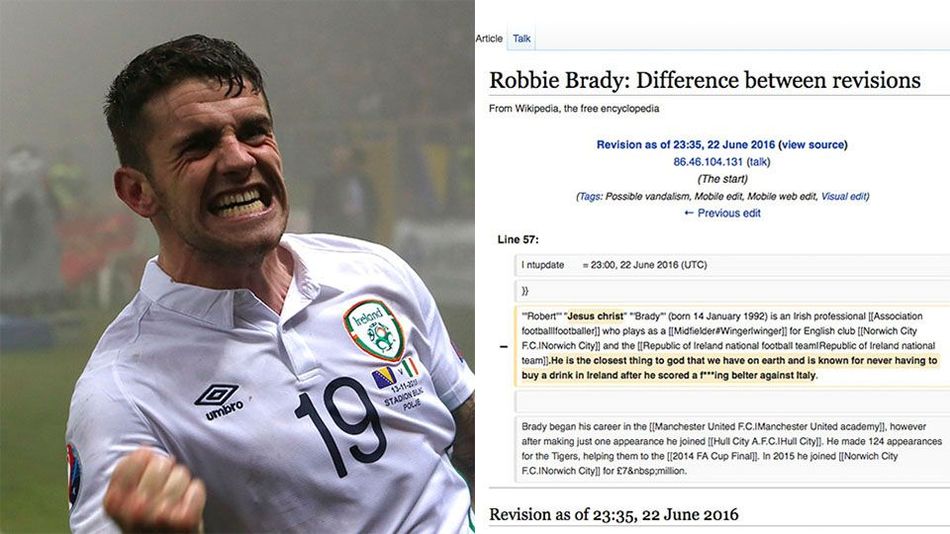前晚歐洲國家盃分組賽,愛爾蘭憑藉完場前的入球擊敗意大利,得以晉級 16 強。在 85 分鐘取得入球的 Robert Brady 亦成為了愛爾蘭球迷心目中的英雄。而網民向 Brady「致敬」的方式,就是在維基百科修改他的個人檔案。