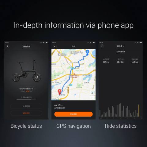 小米 Qicycle 重 14.5 公斤,可以對摺方便儲存,擁有一個 250W 摩打和 3 速花鼓,為騎車者提供輔助,其電池每次充電後可以提供約 45 公里的續航距離。作為小米品牌的出品,能夠利用藍牙和手機 App 連接理所當然,單車的狀態、騎行的距離和 GPS 導航等資訊通通都可以在手機 App 取得。
