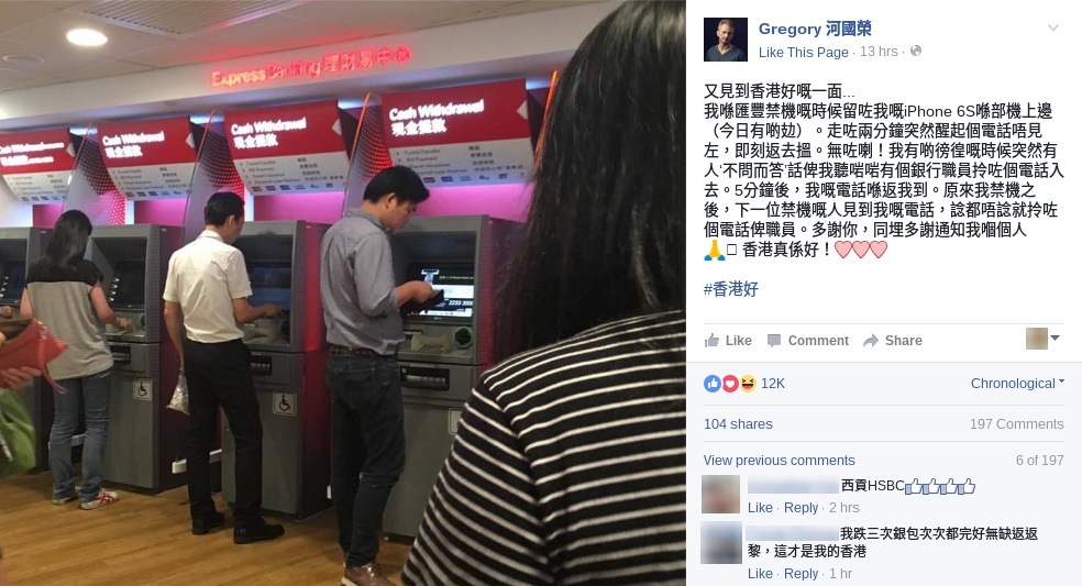 對比起笑笑口貼一張自拍相到 Facebook、微博向消防員致敬;明蝠俠低調地行善,然後被有心人爆出來,網民的迴響更大。提起好人好事,昨日在 Facebook 見到真. 香港人河國榮的貼文,亦是一宗值得宣揚的好人好事。河國榮在匯豐銀行櫃員機提款時,一時不慎把 iPhone 遺漏了在櫃員機,兩分鐘後才發現,返回銀行已經發現 iPhone 不見了。