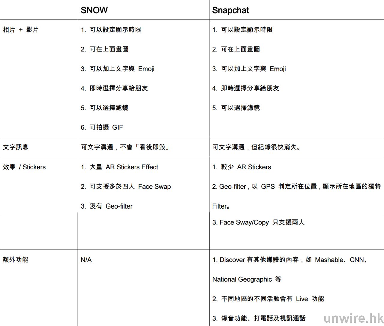 SNOW 既然跟 Snapchat 這麼相似,到底有何分別?可以參考下圖對兩者的比較。