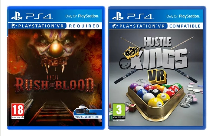 和玩家常見的 PS4 遊戲一樣,PSVR 遊戲依舊採用藍色的膠盒包裝。不過在遊戲封面上就有 PlayStation VR 字樣,遊戲有分支援 VR(Compatible)和必須要 VR(Required)兩種,前者玩家可以選擇是否以 VR 方式進行,後者則必須擁有 PlayStation VR 設備。值得留意的是,部份 VR 遊戲只需 PS4 DualShock 4 手掣就可以,有些遊戲則要求 PlayStation Camera 或 MOVE 控制器,遊戲封面的右下角都會有圖示清楚說明。