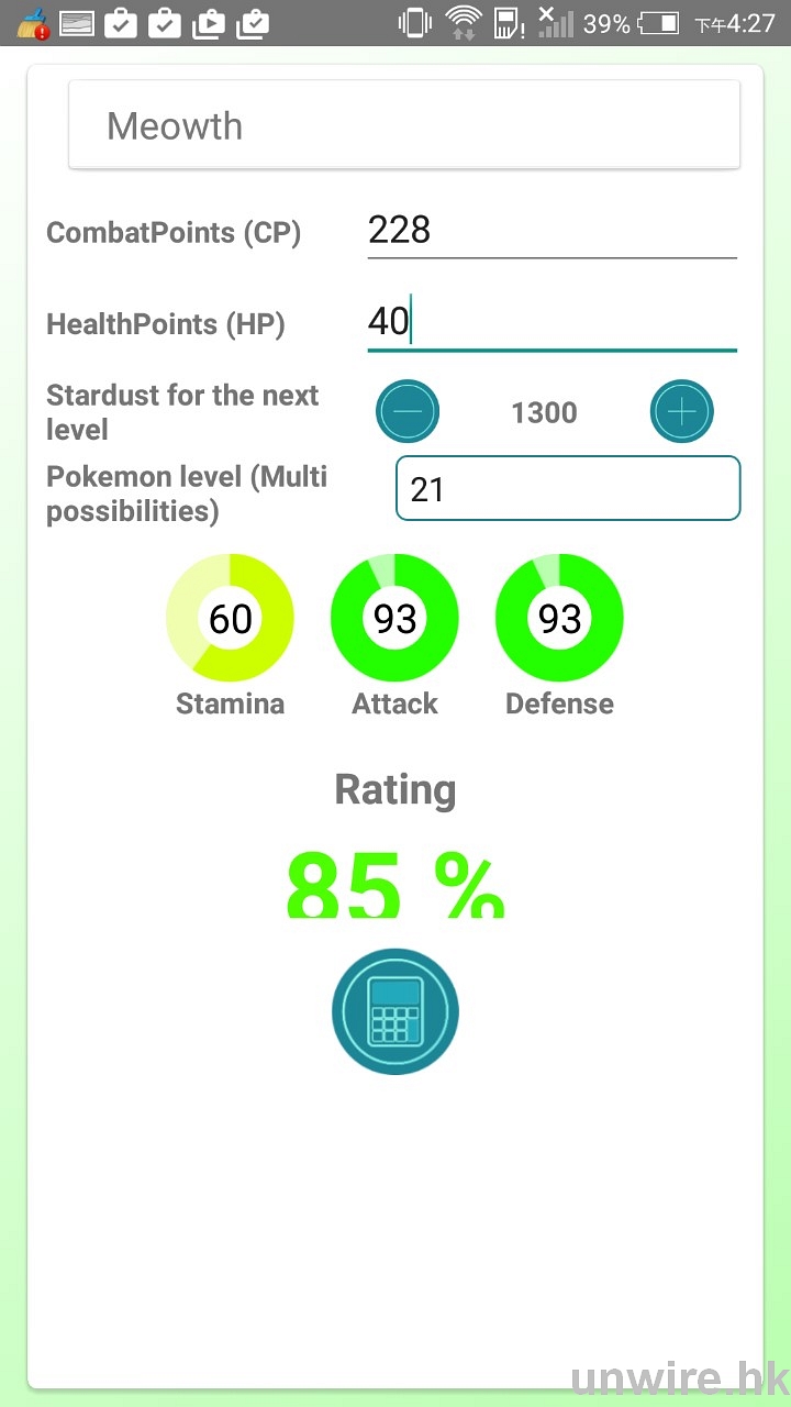▲填寫好精靈名稱、現時 CP 值、使用 Stardust 數量及 HP 值後即可計算,計算以百分比顯示,越接近 100% 代表越好。