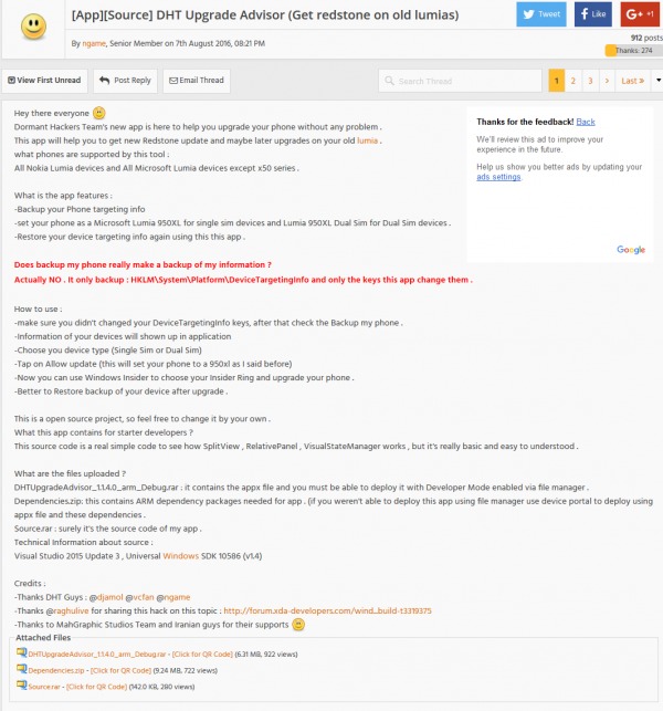 這套非官方的軟件 DHT Upgrade Advisor 能夠瞞騙系統,讓系統以為連接的 Nokia 或 Microsoft Lumia 手機是 Lumia 950XL,從而成功透過 Windows Insider Ring 安裝 Windows 10 Mobile 週年升級。不過這套軟件並不支持 512MB RAM 的手機,亦無法由 Windows Phone 8.1 升級至 Windows 10 Mobile。