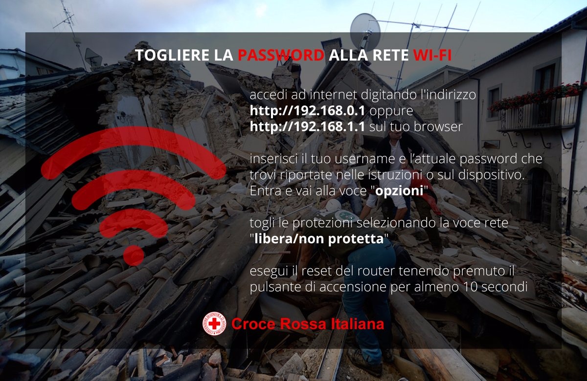 本週三清晨,意大利中部城鎮阿馬特裏切發生黎克特制 6.2 級淺層地震,至今已經造成 247 人死亡,當地相信不少市民被倒塌的建築物活埋。當地紅十字會呼籲市民將 Wi-Fi 密碼移除,以方便通訊和協助救災。呼籲透過意大利紅十字會官方 Twitter 發出,並且獲得不少網民轉發。