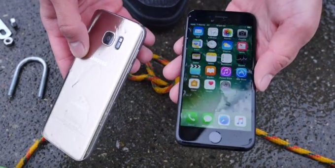 網站 EverythingiPhonePro 將兩部手機同時放在 5、10、15、20 和 30 尺的河水中,每次浸泡 5 分鐘,期望能夠找到 iPhone 7 和 Galaxy S7 的極限。在頭 4 輪測試中,兩部手機都能夠順利過關,觸控屏幕、Home 鍵和相機鏡頭都運作正常,亦沒有入水。到了 30 尺水深浸泡後,Galaxy S7 出現自動重啟的狀況,而 iPhone 7 則仍然正常。為了進一步測試,兩部手機被放入 35 尺水深再浸泡 5 分鐘,結果 Galaxy S7 在取出後被發現螢幕變黑,手機無法開機,至於 iPhone 7 除了螢幕有水漬,其餘功能正常。