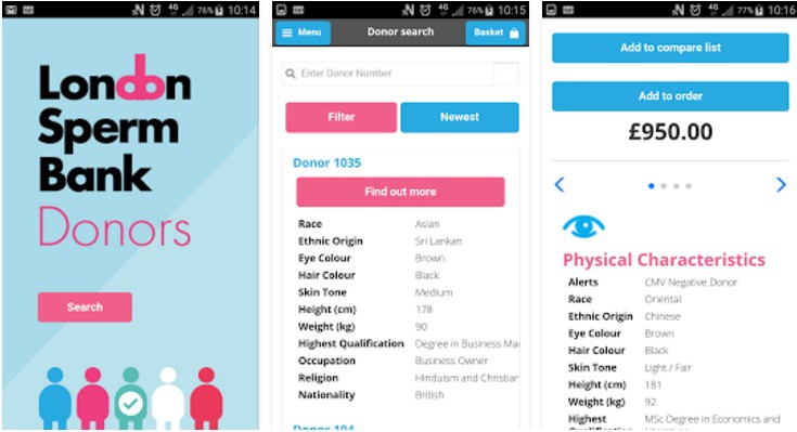 有倫敦精子銀行開發的手機 App,讓準備人工受孕的女士通過手機,從不同捐贈者中選取合適的精子類別。手機 App 會提供一系列選項,包括捐精者的身高、種族和頭髮顏色,顧客選擇完成後,只需支付 950 英鎊,倫敦精子銀行就會將訂購的精子,送到女士選定進行人工受孕的診所。現時英國有大約一半的人工受孕診所,包括私人性質還是國營的診所,都支援這款手機 App 和服務。