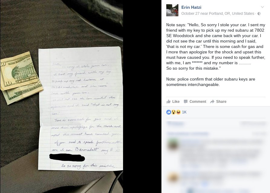 美國波特蘭日前發生了一宗罕見的偷車案,一名女士誤將他人的 Subaru 汽車駛走,最後發現後將汽車駕駛回原地歸還予車主,並且留下懇切的道歉字條和金錢作為油錢的補償。被偷走汽車的 Erin Hatzi 將字條和金錢上載到 Facebook,之後被網民瘋傳。