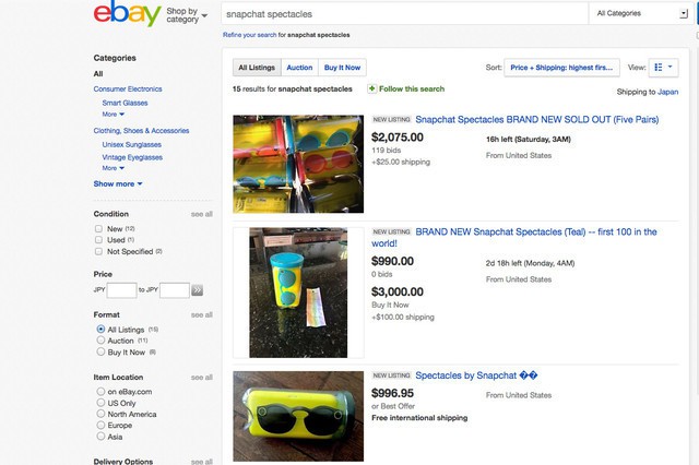 原本價值 130 美元(約 1,008 港元)的 Spectacles,炒家現在已經於 eBay 放售,最高價格達 3,000 美元(約 23,274 港元),似乎以 Snap 的銷售策略,炒價還會維持一段時間。