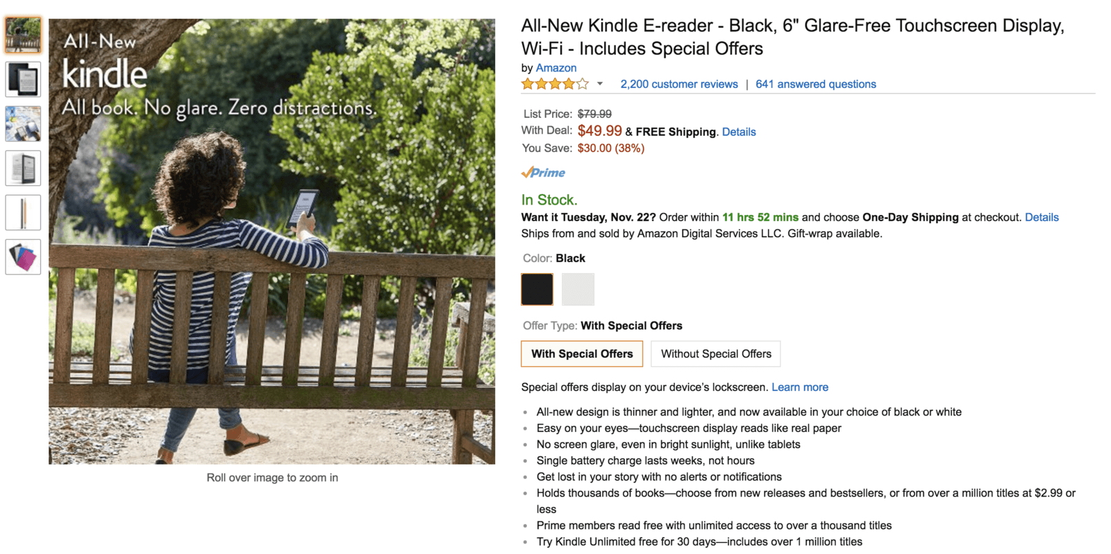 如果講起電子書閱讀器,相信大家都會立即想起 Amazon 推出的 Kindle,他們今年都有推出新機版本,內置 4GB 容量及 6 吋熒幕,香港要買水貨都要 7 舊水左右,但而家在 Amazon Black Friday 特賣,只需要 US$49.99(約 HK$390),比原價 US$79.99 平成 38%,而比香港水貨價都平接近一半!相信就算計埋運費,都抵過係香港買水貨。但呢個版本,首先大家要忍到 screensaver 會出現不同的促銷信息,如果想眼不見為乾淨,都有「Without Special Offers」版本,售價為 US$69.99(約 HK$546),比原價 US$99.99 都平 30%,亦仍然比香港買水貨平。喜歡睇書但又唔想買實體書的 wire 民,入手係時候了!