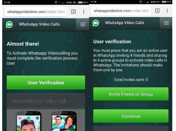 騙徒在 WhatsApp 散佈連結短訊,點擊連結會被帶到假扮 WhatsApp 的網站,表示 WhatsApp 推出了最新的視像通話功能,只要輸入個人資料再邀請 4 位朋友,並在 4 個群組張貼連結,就可以得到啟動新功能的邀請。騙徒更指 WhatsApp 的視像通話能夠 5 人同時進行,事實上視像通話只支援單對單。點擊這些虛假連結除了有機會洩露個人資料,亦有可能成為不法分子入侵的切入點。