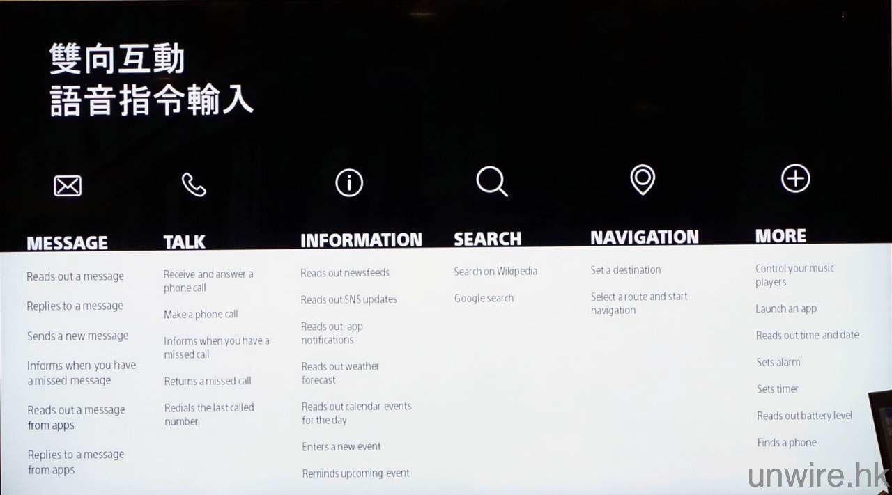 ▲支援雙向互動功能,不但可將文字訊息,例如:WhatsApp、Facebook Messenger 等 APP 收到的訊息,以語音讀出來讓大家聽到,更可以用語音回覆對方,連手機都不用拿出來。用家亦可以用語音查詢資料、天氣等,亦可用語音功能進行導航、檢查新聞等,十分強勁!但最可惜的是暫時不支援中文(廣東話及國語均不支援),筆者有向 Sony 官方查詢過是永久不支援還是暫時未支援,得到的答案是官方未有支援中文的時間表,看來有心入手的用家要留意這一點了。