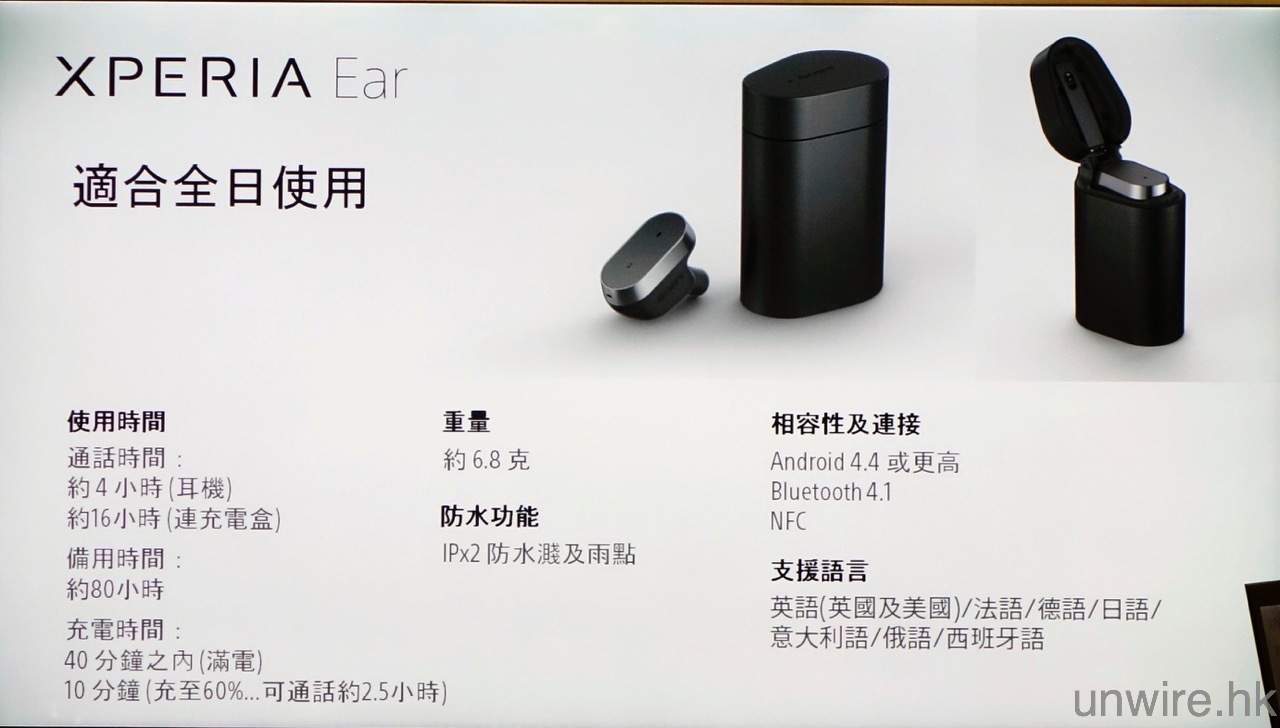 另外,Sony 亦同場推出了最新的智能藍牙耳機 Xperia Ear,體積十分細小,而且只有單邊設計,屬於主攻通訊、聯絡等功能的智能藍牙耳機。它最特別之處是支援不同的智能功能,包括:具備雙向互動功能,例如可以用聲音讀取文字訊息並以語音回覆;亦支援體感操作;最後亦可透過官方軟件 Xperia Ear 設定不同操作方法。至於感受方面,它的體積十分細小,戴上耳朵並不會感受到重量;而且亦設有不同尺碼的耳托及耳塞供不同耳殼及耳道直徑大細的用家使用,十分體貼。至於售價方面就為 $1,598,將於 12 月中至下旬發售。