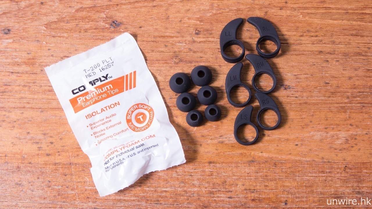 ▲ 隨機附送 3 對不同尺寸的矽膠耳塞及耳翼,以及一對 Comply T-200 耳棉。