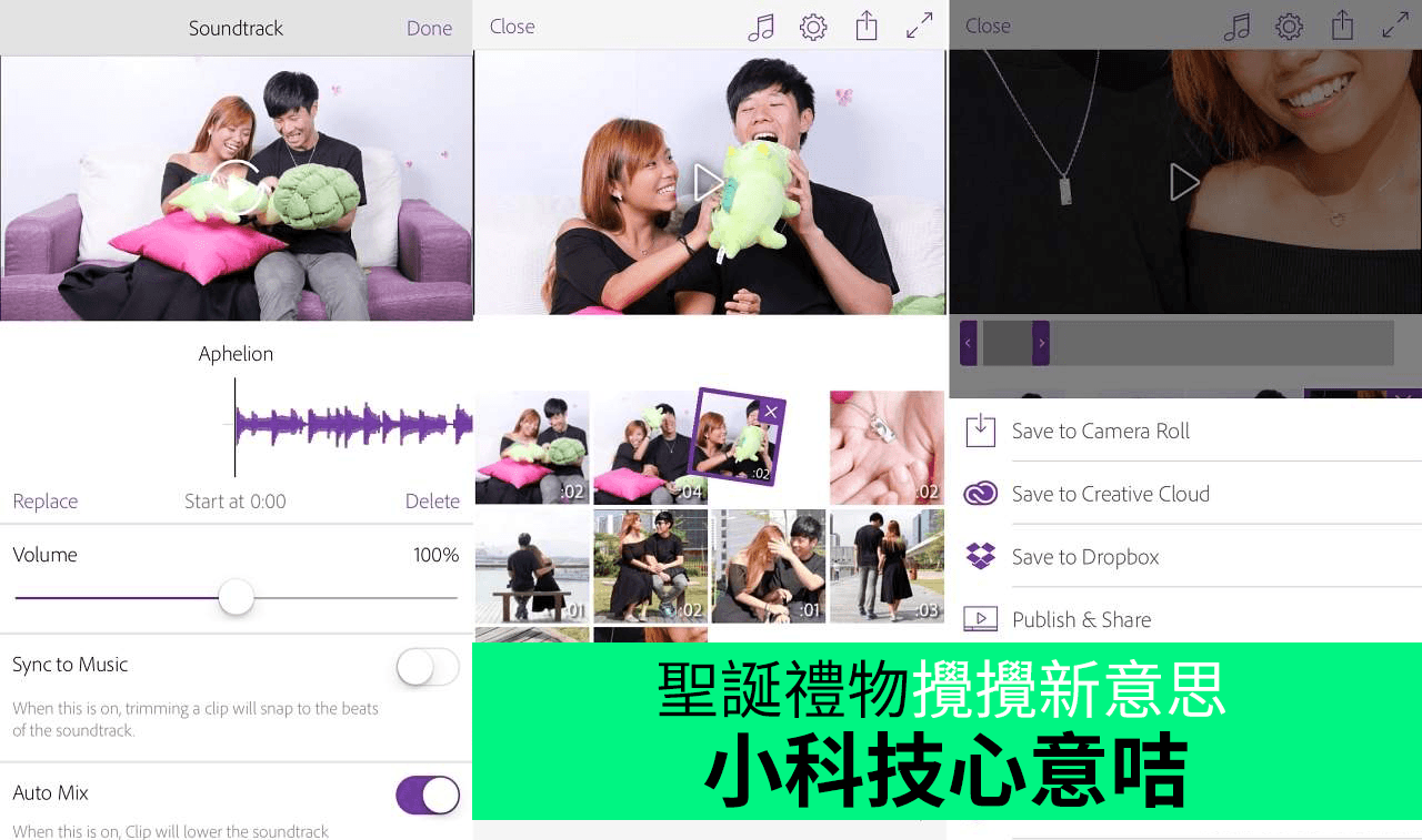 ▲之後可以儲存背景音樂,為相片加入不同的濾鏡或特別效果,最後同樣可儲存在手機。