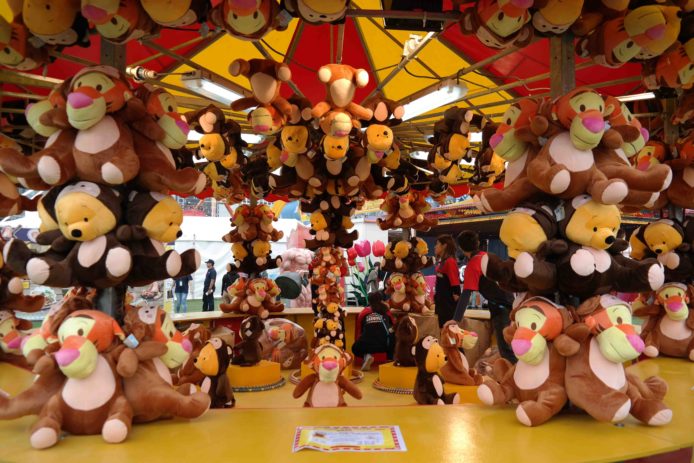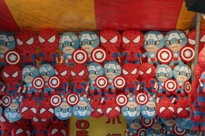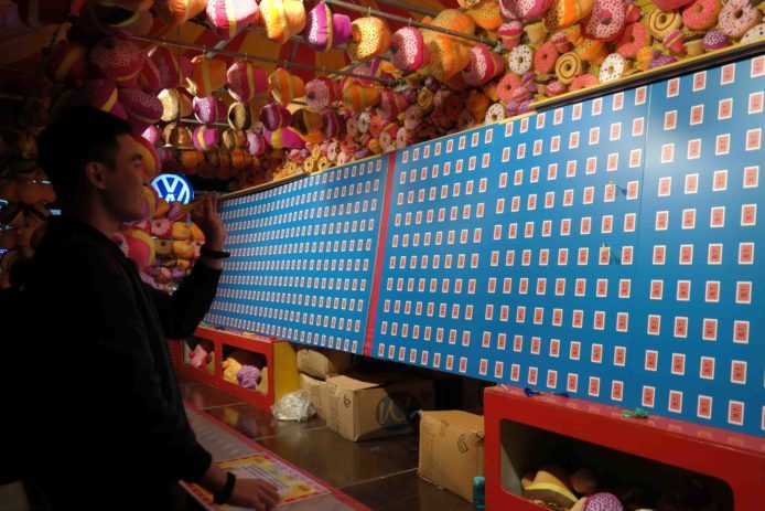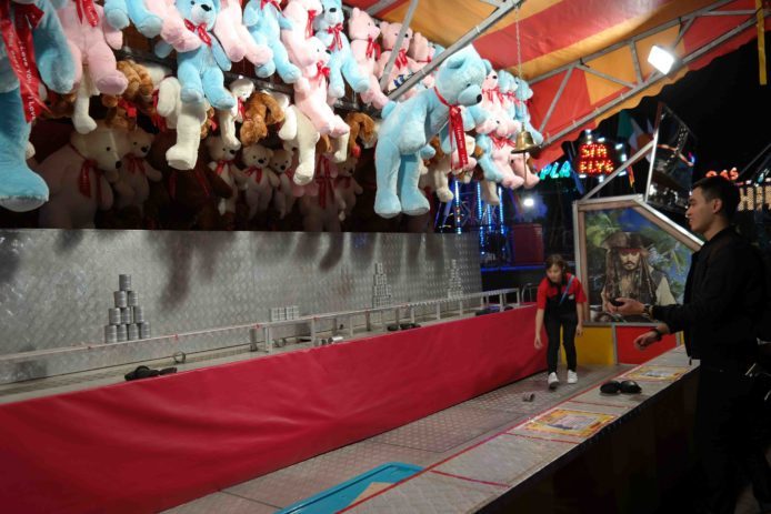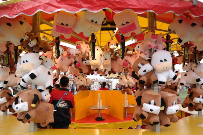 神投手 – 看似很易,但又是一個伏啊!伏在哪?就在於你看到上圖底下的四個罐。玩這個攤位遊戲會有四次機會,很多人認為用力對準上面擲豆袋就可以,但其實重心在於底下的四個罐;要成功,小編是強烈建議先從那四個罐下手。一但底下的基礎毀了,上面就會倒下或者很好應付;但上面倒了而留了下面的罐,要再瞄準投下就很難了!(特獎的那個熊公仔,小編上年經已嬴了一個,所以這個遊戲小編很快就放棄了 XD)
