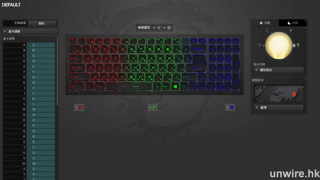 ▲透過軟件就可以將鍵盤的背光設定為不同顏色或閃動方式,更可以將按鍵的功能重新編排。