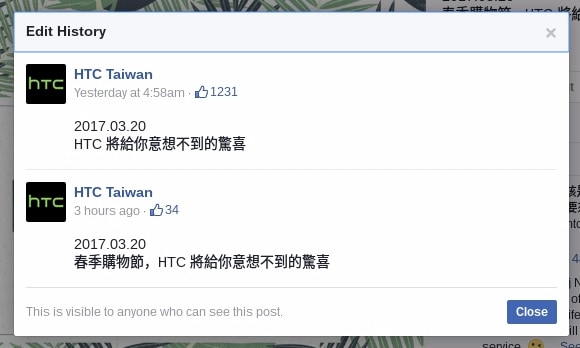 一段含糊的 Facebook 貼文,為網民帶來不少遐想之餘,同時亦帶來不少失望。小編想說的正是日前 HTC 在台灣官方 Facebook 專頁的貼文,原本 HTC 寫著「2017.03.20 HTC 將給你意想不到的驚喜」,並附上一幅「Spring is coming」的圖片,很多傳媒和網民均將之解讀為 HTC 有新機發表。