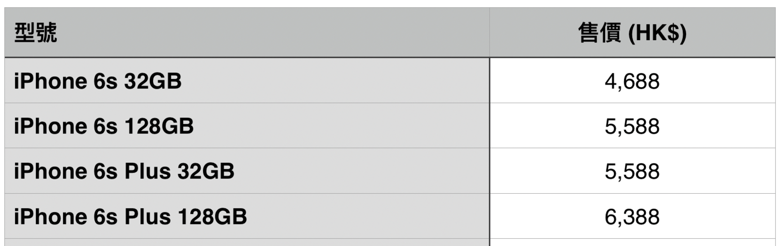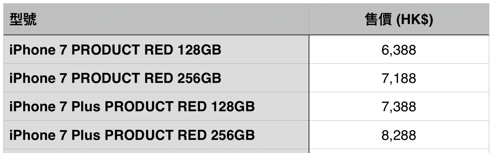 從下面表格大家可以看到,最新推出的 PRODUCT RED 系列紅色特別版 iPhone 7 / 7 Plus 容量、規格及功能基本上與 Jet Black 版是一模一樣的,售價自然亦相同。值得留意的是 iPhone 6s / 6s Plus 及 SE 均更新為只有 32GB 及 128GB 版本,售價亦作出了調整。