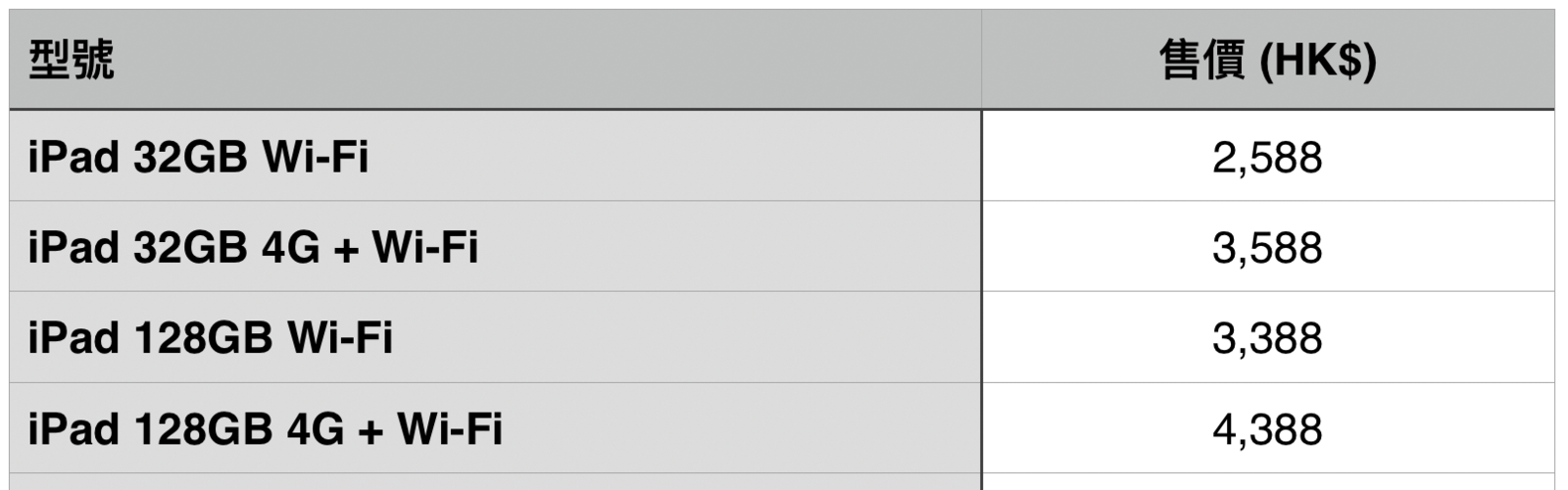 至於 iPad 方面,主力肯定是今晚新推出,用以取代回 iPad Air 系列的全新 iPad。今次 iPad 只是更新了處理器,但售價確實親民,128GB 4G + Wi-Fi 也只售 $4,388,比 iPad Pro 最便宜的版本更低價,確實抵玩!舊機方面,iPad Pro 9.7 吋及 12.9 吋的型號及售價均未見郁動,反而最細熒幕尺寸的 iPad mini 4 就只剩下 128GB 版本,而且售價毫不便宜,相比之下 9.7 吋熒幕的新 iPad 肯定更值得入手。