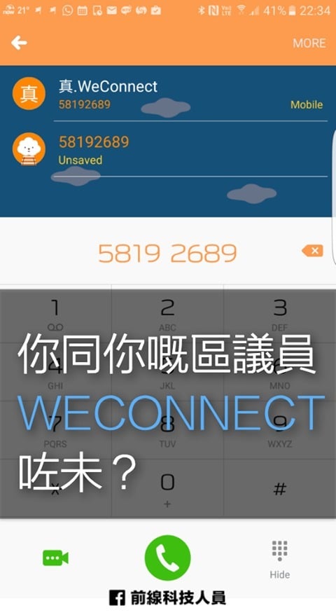 「前線科技人員」專頁推出的「真.WeConnect」服務,市民只需撥打熱線號碼 58192689,再講出你住在哪一區,語音識別系統就會協助搵出該區身兼選委的區議員,然後再將電話接駁到他提供的電話號碼。市民就可以親自將意見向選委表達,甚至查詢對方的投票意向。「前線科技人員」在專頁指所有區議員資料來自公開的政府網頁,而系統所採用的語音辨識則自 Google 的人工智能技術,他們的系統則設置於雲端網絡。