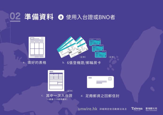 關於入台證方面,則需用備有出境章的入台證作申請,而入台證需要與申請的登機證對應,臺灣觀光局駐港辦事處官方表示建議三/四次的入台證都附上。每人最多可以兌換三次,唯申請第二次和第三次時,每次需備齊4次來回,共八張的登機證。
