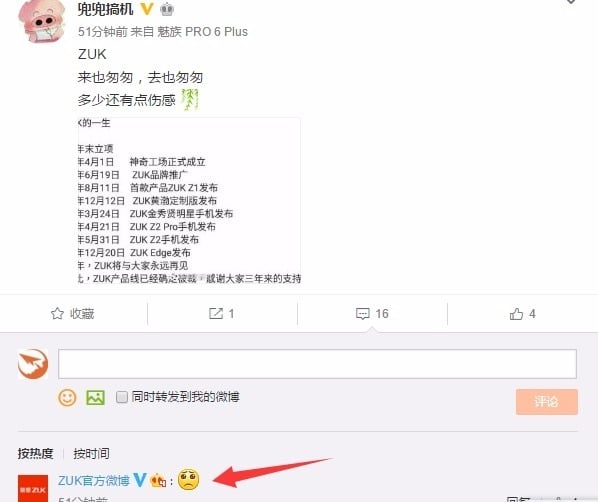雖然傳聞暫時未獲得聯想或 ZUK 的官方回應,證實或否認相關消息;不過在微博的一些留言中,卻可以看到一些端倪。ZUK 官方帳號在網民對 ZUK 的感言中,留下了一個「大哭」的 Emoji 表情符號,似乎暗示著他們也因此覺得傷感。