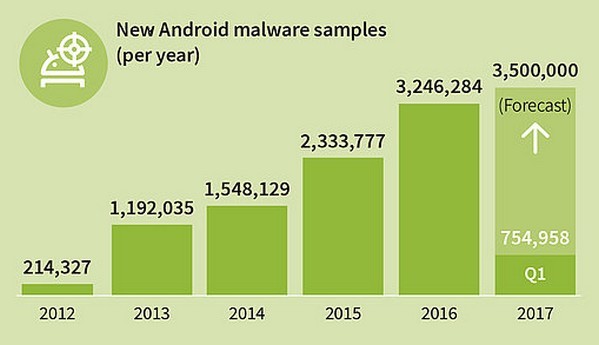 自從 Android 成為市場上最受歡迎的手機系統後,惡意軟件已由 2012 年時的 21 萬個增至前年及去年的 233 萬及 324 萬個,情況相當嚴重。此外 G Data 同時亦指出 Android Lollipop 及 Marshmallow 系統中出現的惡意軟件數量最為顯著,兩者相加起來大約佔整體三分之二。至於防範方法則一如以往,應盡量只到 Google Play 下載各種應用程式,以及要定期將 Android 系統更新至最新版本。