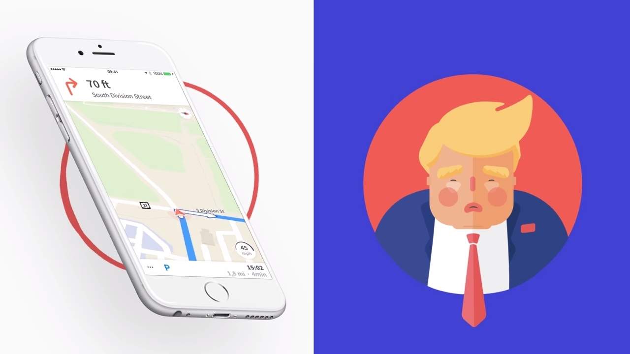 這款名叫 Karta GPS 的軟件有 iOS 和 Android 版本,地圖圖資整合了 Yelp 和 Foursquare。為了宣傳和吸引用戶下載,最近新增了特朗普的導航配音,堂堂美國總統當然不會變成配音員,Karta GPS 只是找了一位專門模仿特朗普的配音員負責,另外還有仿冒的前總統克林頓配音。