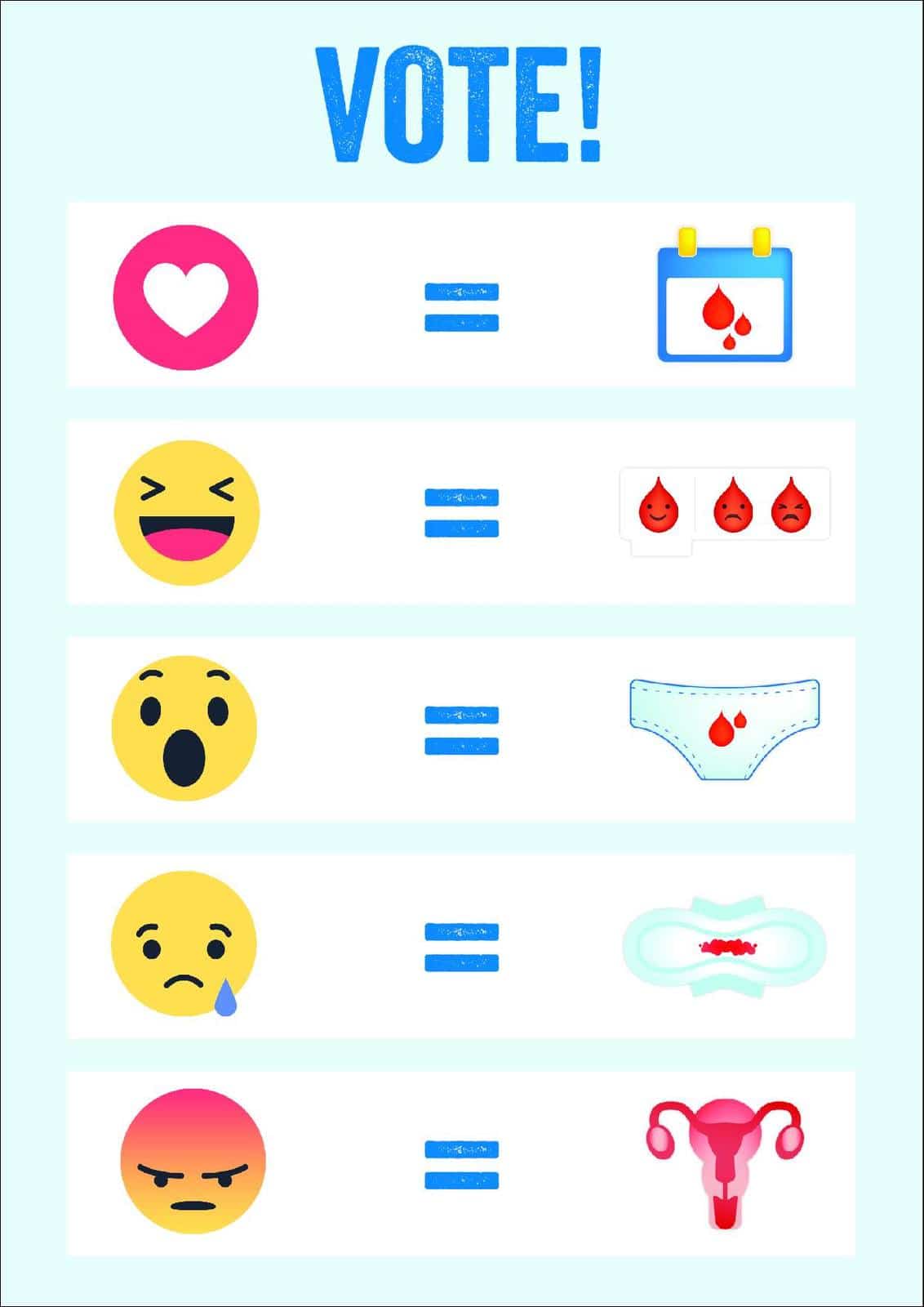 Plan International 設計了 5 款代表女生月事的 Emoji,透過 Facebook 公開讓網民投票,勝出的一款會遞交予 Unicode Consortium(統一碼聯盟),希望最後能正式加入到 Emoji 鍵盤。5 款候選 Emoji 包括了染血的衛生巾、子宮、染血的內褲、日曆和不同表情的經血。發起今次活動的 Plan International 澳州發言人表示,全球有 8 億 15 至 49 歲的女性正值經期期間,Emoji 作為通行全球的語言,卻偏偏沒有一個能代表月經的符號,而老舊的磁碟和長鼻小妖精卻有專屬 Emoji 實在非常荒謬。