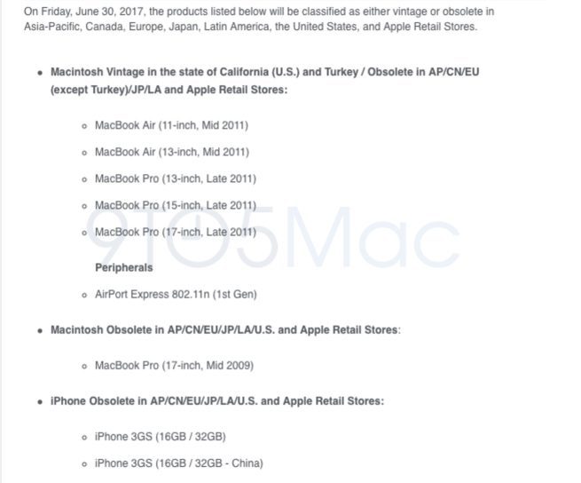在下月底被視作「過期」的 MacBook Air 和 MacBook Pro 均為 2011 年底上市的型號,還有 2009 年中上市的 17 吋 MacBook Pro,還有第一代 AirPort Express 802.11n,亦包括國際版和中國版的 iPhone 3GS 16GB 和 32GB。
