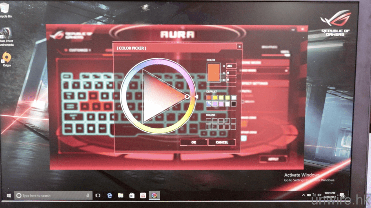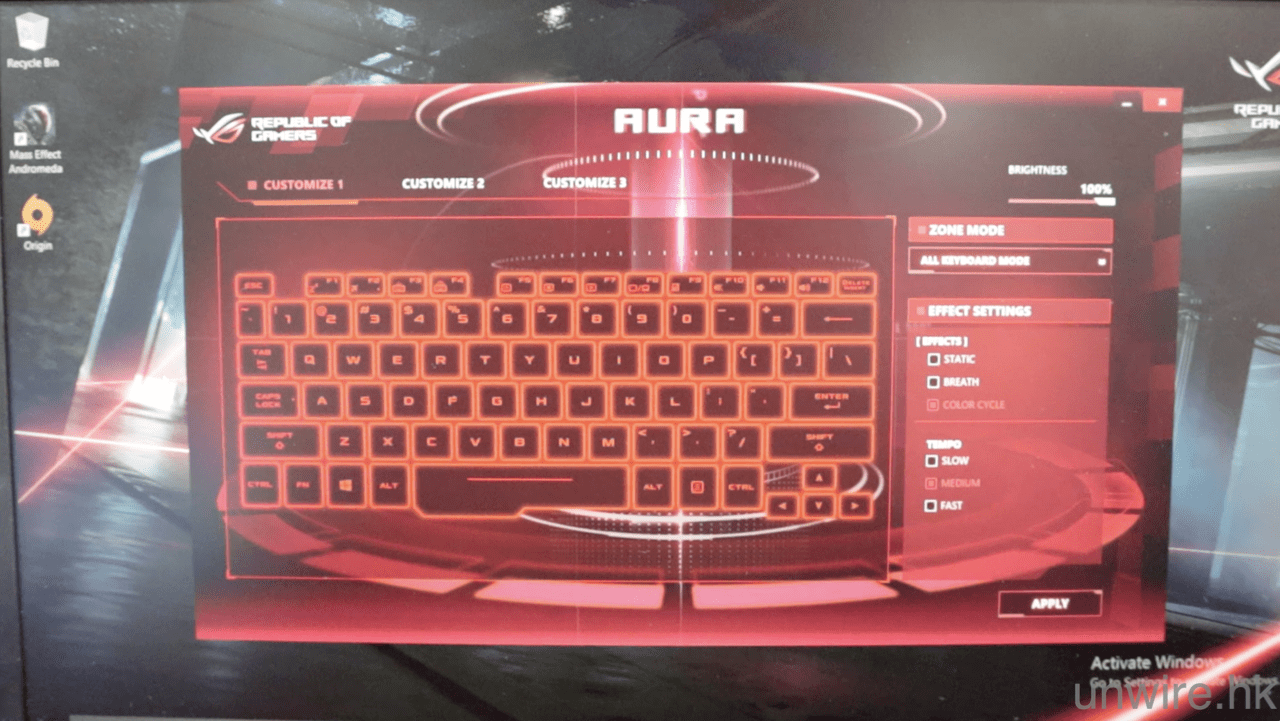 ▲內建了 AURA 軟件,可以讓用家設定按鍵背光顏色,而且可以最多設定 3 個模式,方便在不同情況或遊戲下使用。