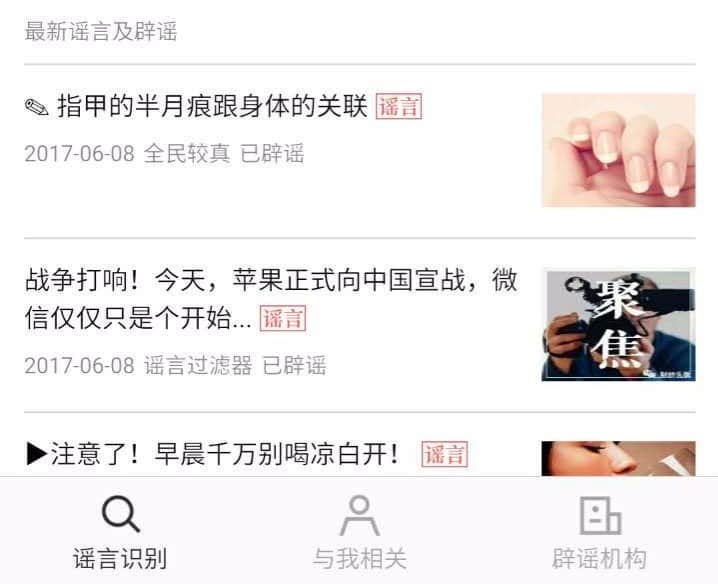 「微信闢謠助手」讓網民可以搜索和識別謠言、接收闢謠提示,甚至查看自己曾經接觸過的謠言訊息。只要輸入關鍵字,網民就可以見到一些已經獲得澄清,或者界定為虛假的謠言內容。微信找來醫生、科技和科學網站、公安部門和新聞機構合作,基本上已經覆蓋了各方面的知識,為網上熱傳的內容分析真偽,減少網民誤信流言和傳播假新聞的機會。