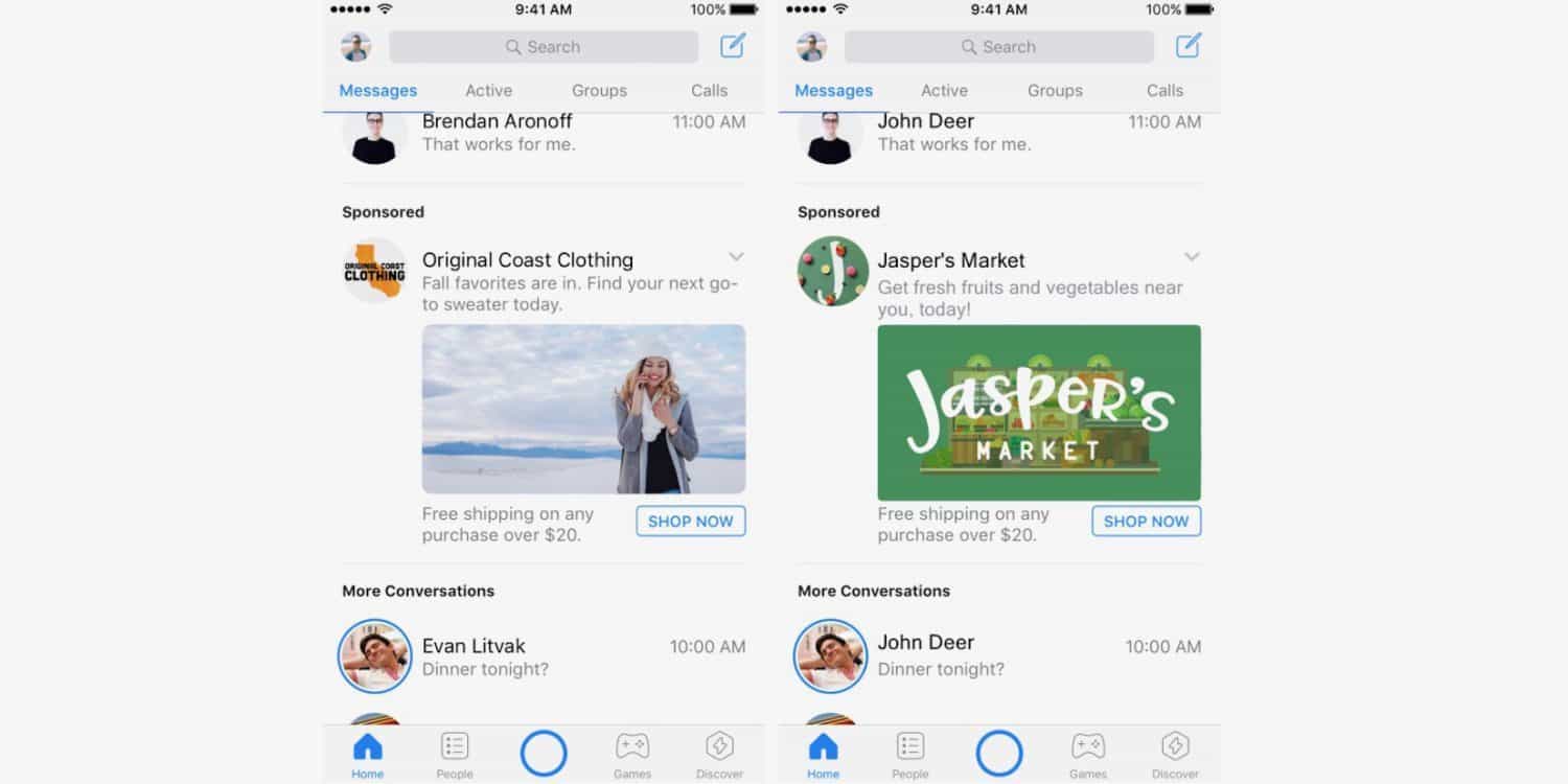 在 Messenger 植入廣告的測試早在今年 1 月已經於澳州和泰國開始,負責 Messenger 項目的 Stan Chudnovsky 表示廣告將會成為 Messenger 的主要商業模式和收入來源,未來他們會開拓更多的商業模式,但都是圍繞廣告進行。刊登廣告會以價高者得為原則,目標是要令用戶跟客戶的代表或機械人互動,而商業機構只可以在跟用戶展開對話後,方能夠向對方發送廣告宣傳訊息。