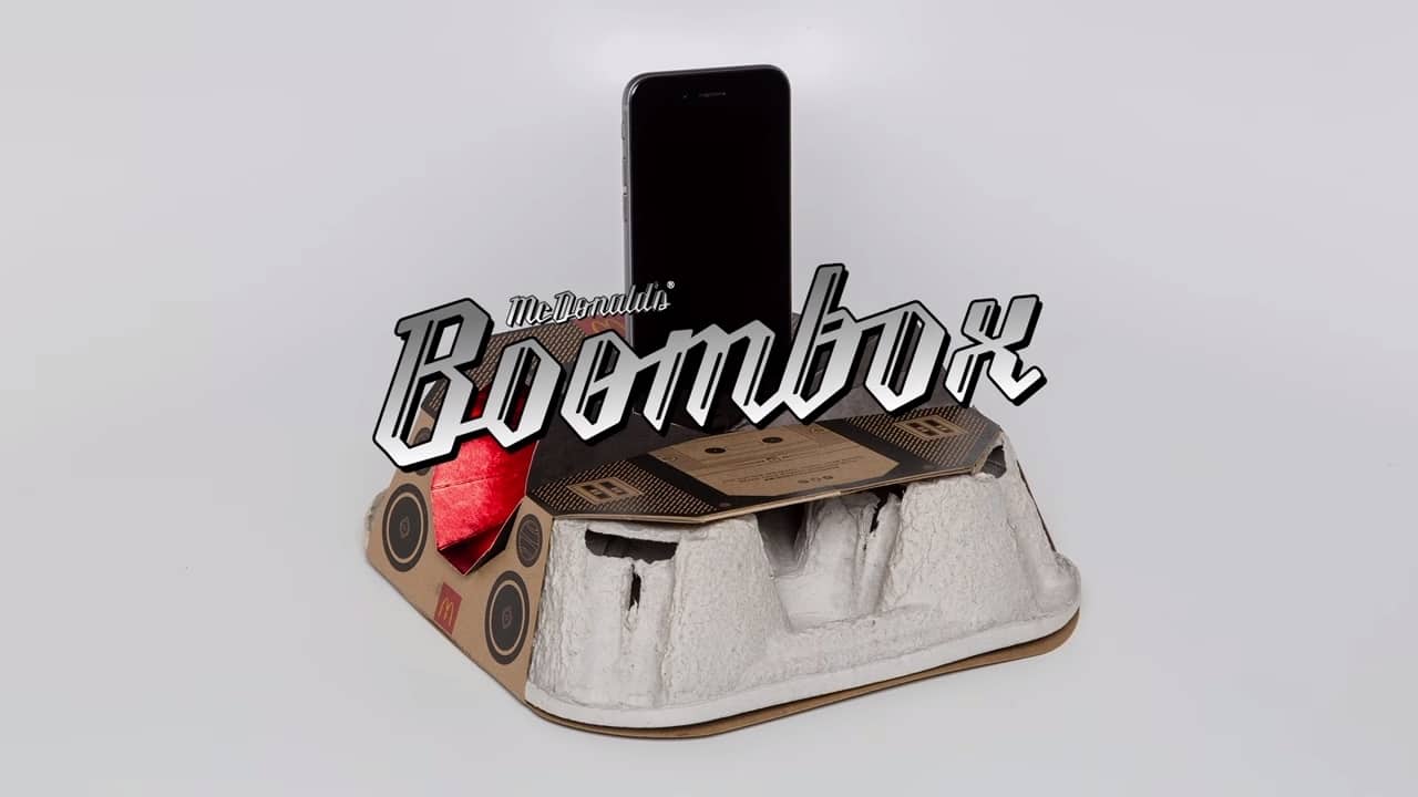 得到大學科研人員和設計公司的加持,紙製杯架變身成毋須插電的 Boombox 擴音器;用戶只要將手機插入,就可以將音量放大 101%。Boombox 的原理和將手機插入紙杯,透過反射做到擴音效果類似,但經過設計師的精密計算和設計,加上使用合適的物料,效果變得更理想。可惜的是,Boombox 只在多倫多某間分店短暫派發數小時,麥當勞未有打算全球推出。