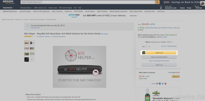 以今次購物為例,我在Amazon.com購買了Bite Helper,填寫Buyandship的美國倉庫地址。付款後在Buyandship填寫貨品資料,即可追蹤貨件。到倉後可選擇不同的郵寄和領件方式。這樣下來,我只用了25美元即可買Bite Helper,加上運費總共只花了約225港元,相比起香港實體店或網店實在便宜許多。