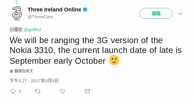 就是新版 Nokia 3310 只支援 2G 網絡,畢竟現時 4G 網絡已經非常普及,部份國家甚至陸續停用 2G 網絡,HMD 這決定令新版 3310 的吸引力大打折扣。不過愛爾蘭電訊商 3 為消費者帶來好消息,他們早前宣佈 3G 版的 Nokia 3310 將會在 9 月底或 10 月初推出,售價則尚未公佈。