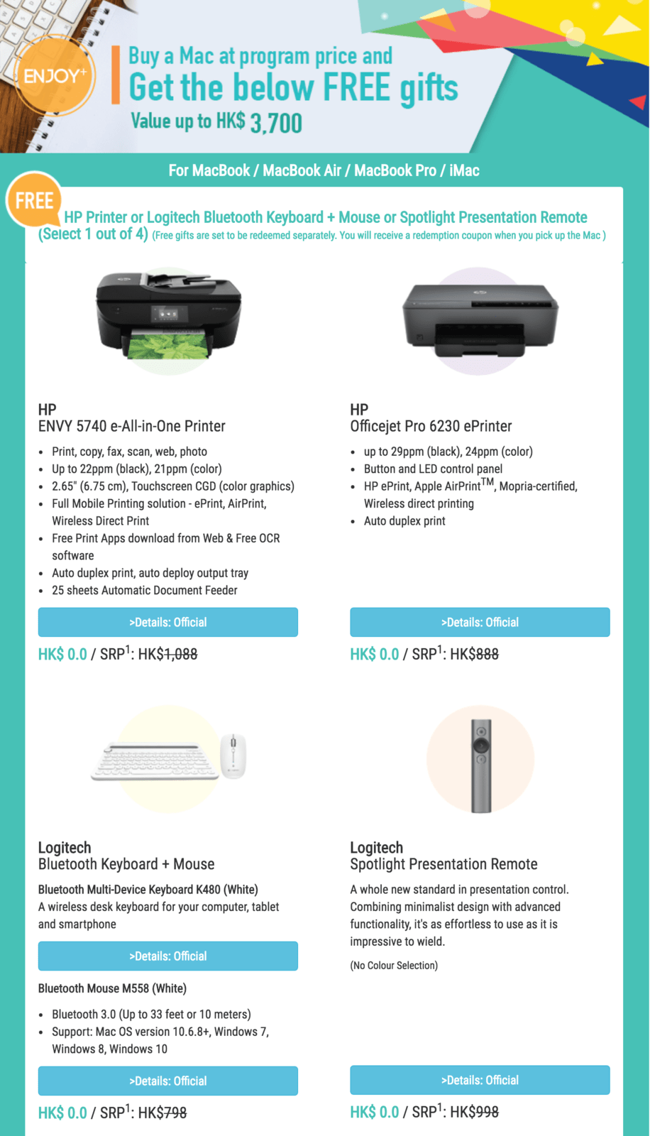 ▲買 Mac 只送打印機、藍牙鍵盤 + 滑鼠等周邊產品,折扣率亦沒有其他品牌高,不算吸引。