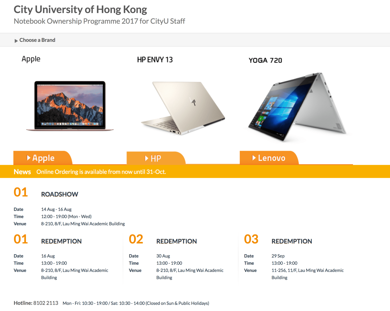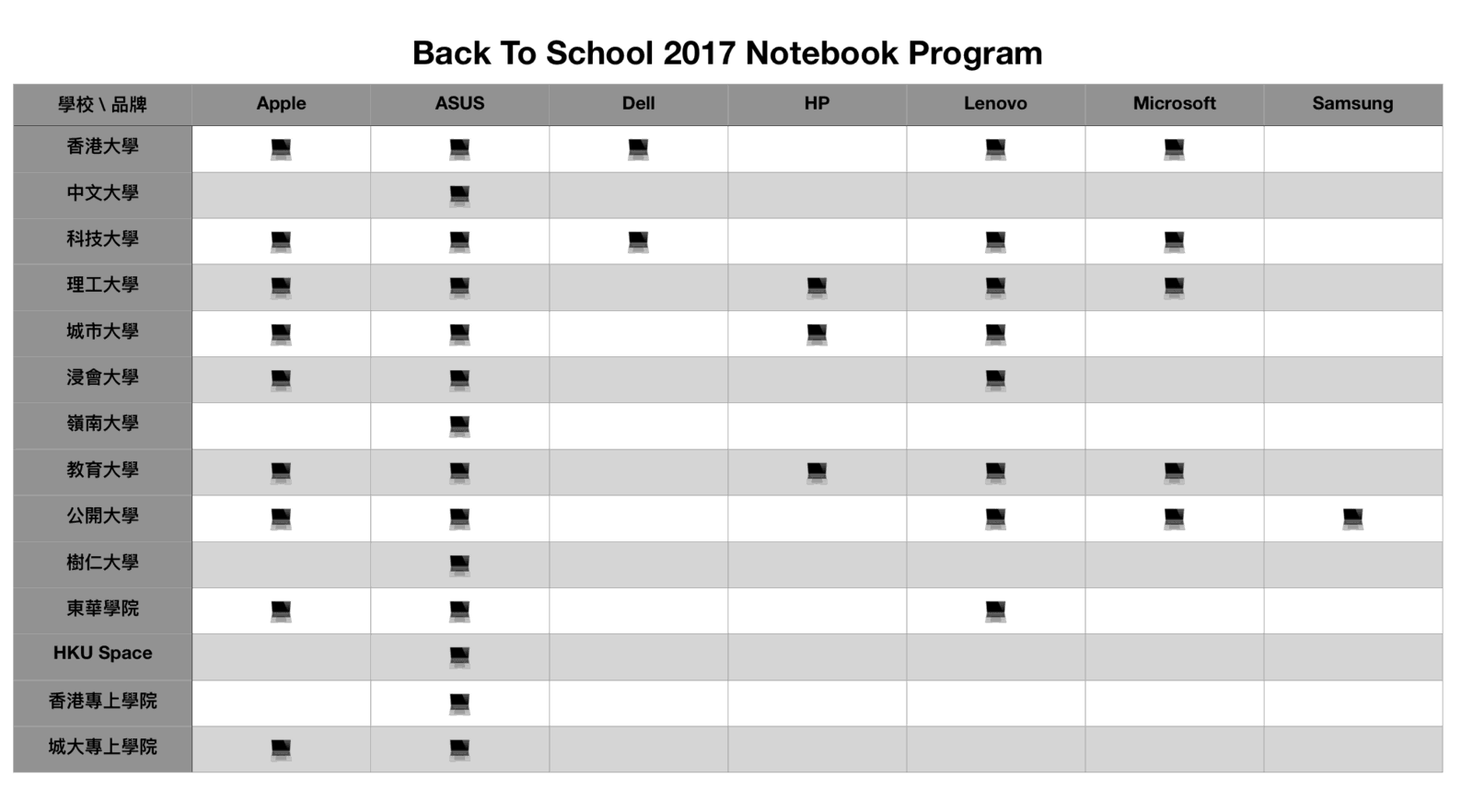 香港大學:https://www.hknotebook.com/np17/hku/ (Apple、Dell、Lenovo、Microsoft)