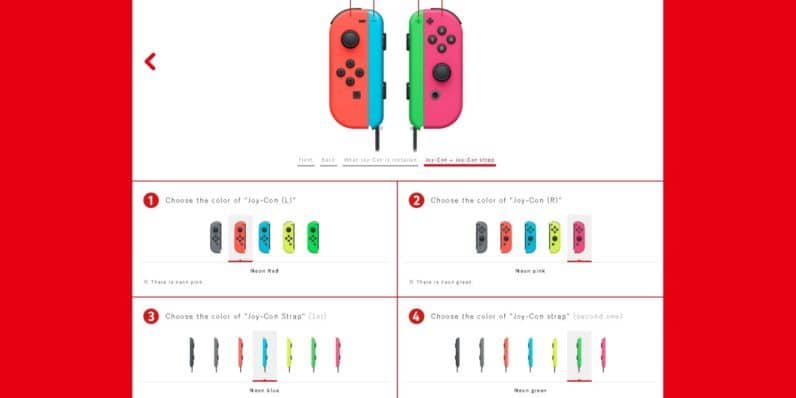顧客只要登入日本任天堂官網,就可以為自己的 Switch 選擇 Joy-Con 手掣的顏色,當中包括遊戲《Splatoon 2》同梱包專屬的霓虹色系和《ARMS》專屬的螢光黃色。不過任天堂還是作出了一些限制,例如霓虹色系的綠色只限用於左手的 Joy-Con,而粉紅色則為右邊,相信這和任天堂的生產流程有關。