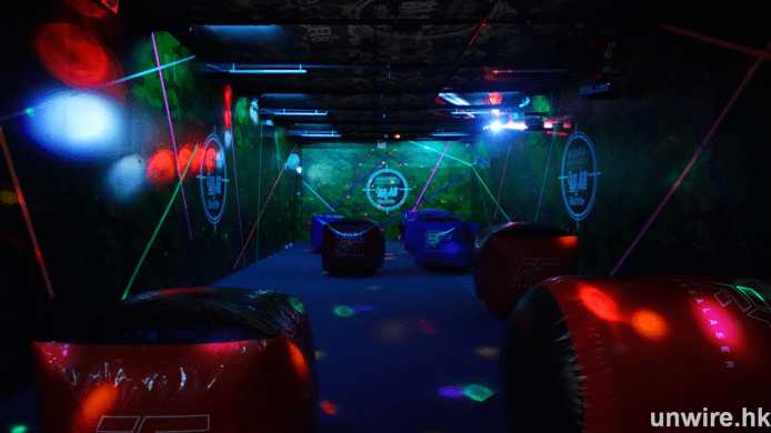 場內分成三個區域,最先映入眼簾就是鐳射槍wargame場。場內十分昏暗,玩家需靠著少許光線作戰,配合特製的幻彩燈光效果、煙效、音樂,氣氛十分刺激。每節入場人數上限為6人,分成兩組對賽。工作人員指導鐳射槍基本用法及比賽規則後,即可開始比賽!
