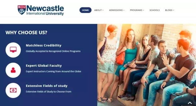 被不法份子睇中的紐卡素大學,原本的官方網站域名為 www.ncl.ac.uk(上圖),騙徒就註冊了域名 newcastleinternationaluniversity.com,並且製作了以假亂真,看似非常專業的釣魚網站(下圖)。假網站有比真正官網更明顯的校徽,設計亦更加時尚,雖然網站有大量課程資料,由本科到博士研究生都有,又接受網上申請入讀,但只要仔細瀏覽比對,就會發現兩者其實相差很多。