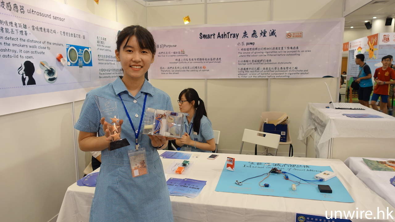 而計劃書設計比賽季軍,何文田官立中學的隊伍則設計了可以消除煙味的作品「灰飛煙滅」。隊員之一的戴婉晴指,等巴士的時候,發現車站旁的垃圾桶煙灰缸經常有未熄滅的煙頭,釋出難聞氣味,因此設計出一個「智能煙灰缸」置在垃圾筒上。