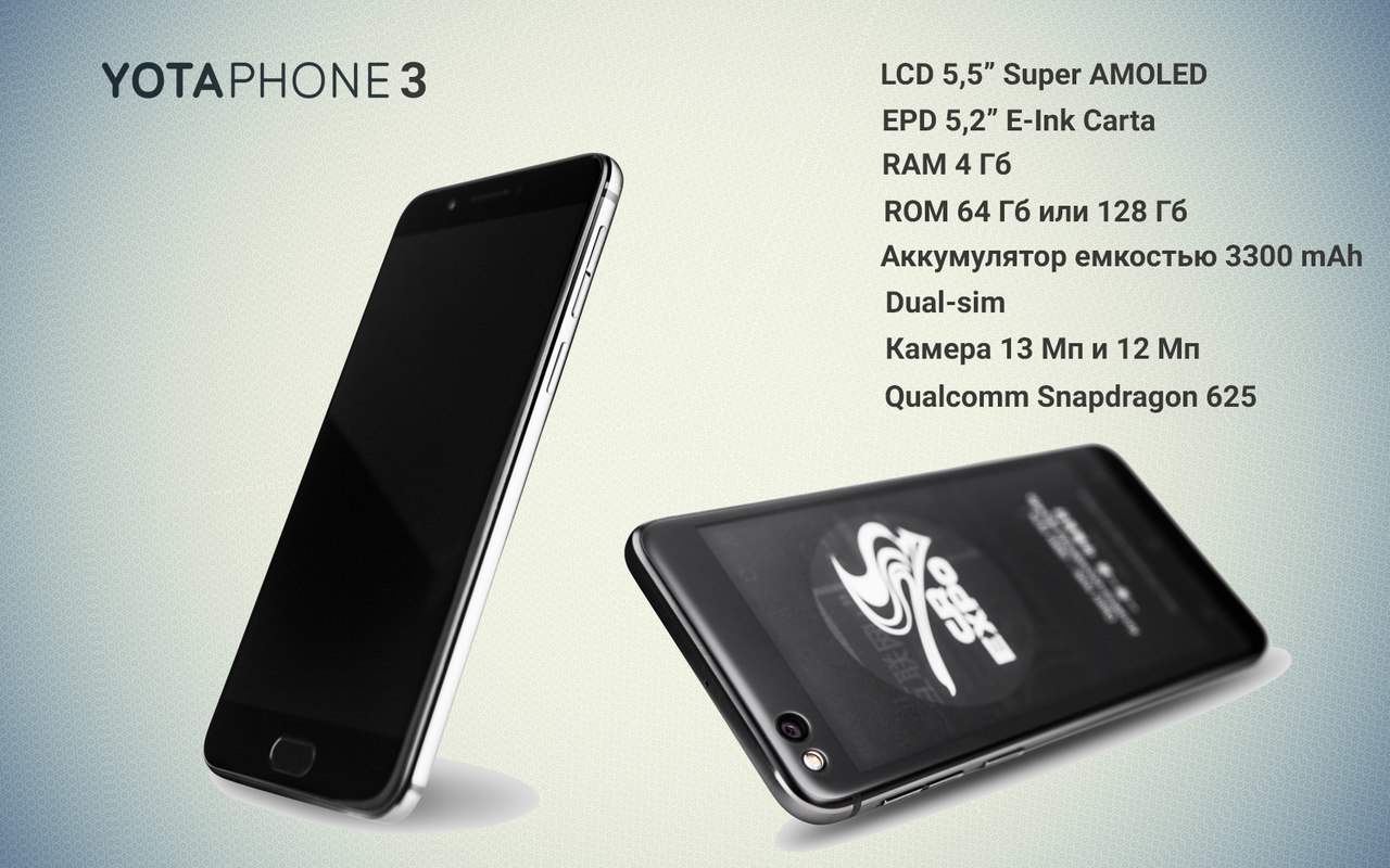 其他規格還包括使用 Qualcomm Snapdragon 625,搭配 4GB RAM 和 64GB 或 128GB 儲存,13MP 主相機配 Dual Tone LED 閃光燈和 12MP 前置鏡頭。YOTA3 內置 3,300mAh 電池,預載系統為 Android 7.1.1 Nougat,並使用 USB Type-C 接口。YotaPhone 表示手機的目標顧客為喜歡透過流動裝置閱讀的年輕讀者和書蟲,YOTA3 預載了多個電子書閱讀器,亦和大陸著名電子書供應商咪咕文化、樂書、iReader 等合作。