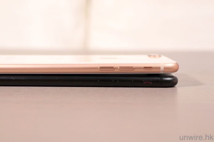 ▲至於機邊,iPhone 8 Plus(上)與 7 Plus(下)也是採用金屬物料,而左側仍然設有音量鍵及一鍵靜音鍵。