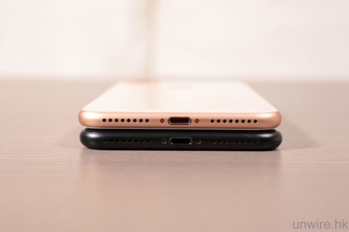 ▲iPhone 8 Plus 機頂仍然未有設置任何端子及插槽,機底就依然設有內置喇叭及 Lightning 插槽。