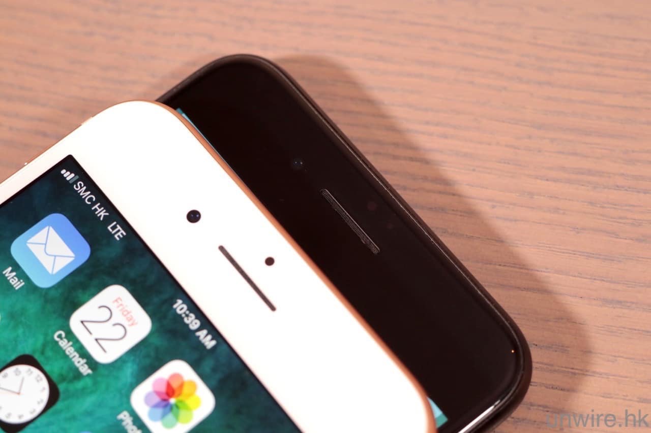 ▲不過硬要比較的話,其實可以見到 iPhone 8 Plus(白色邊框)比 iPhone 7 Plus(黑色邊框),在聽筒上方少了一個感應器,不過筆者瀏覽過官方網頁,iPhone 8 Plus 的感應器與 7 Plus 是一模一樣的,所以功能沒有少到。