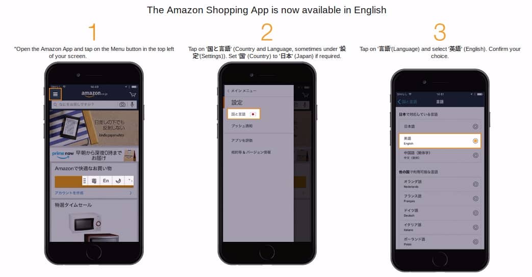 日前 Amazon 進行內部改版,為日本版網店加入更多語言選項,除了英文介面,還提供中文介面選擇,可惜的是中文介面只有簡體字,沒有我們熟悉的正體中文。希望在 Amazon 日本網店購物,下載和安裝 Amazon 手機 App 後在 「Country and Language」先選擇「Japan」,再在 Language 選擇英語或中國語(簡體字)。Amazon 的手機 App 有 iOS 和 Android 兩個版本,不過需要注意的是,並非所有網店都願意寄送到香港。